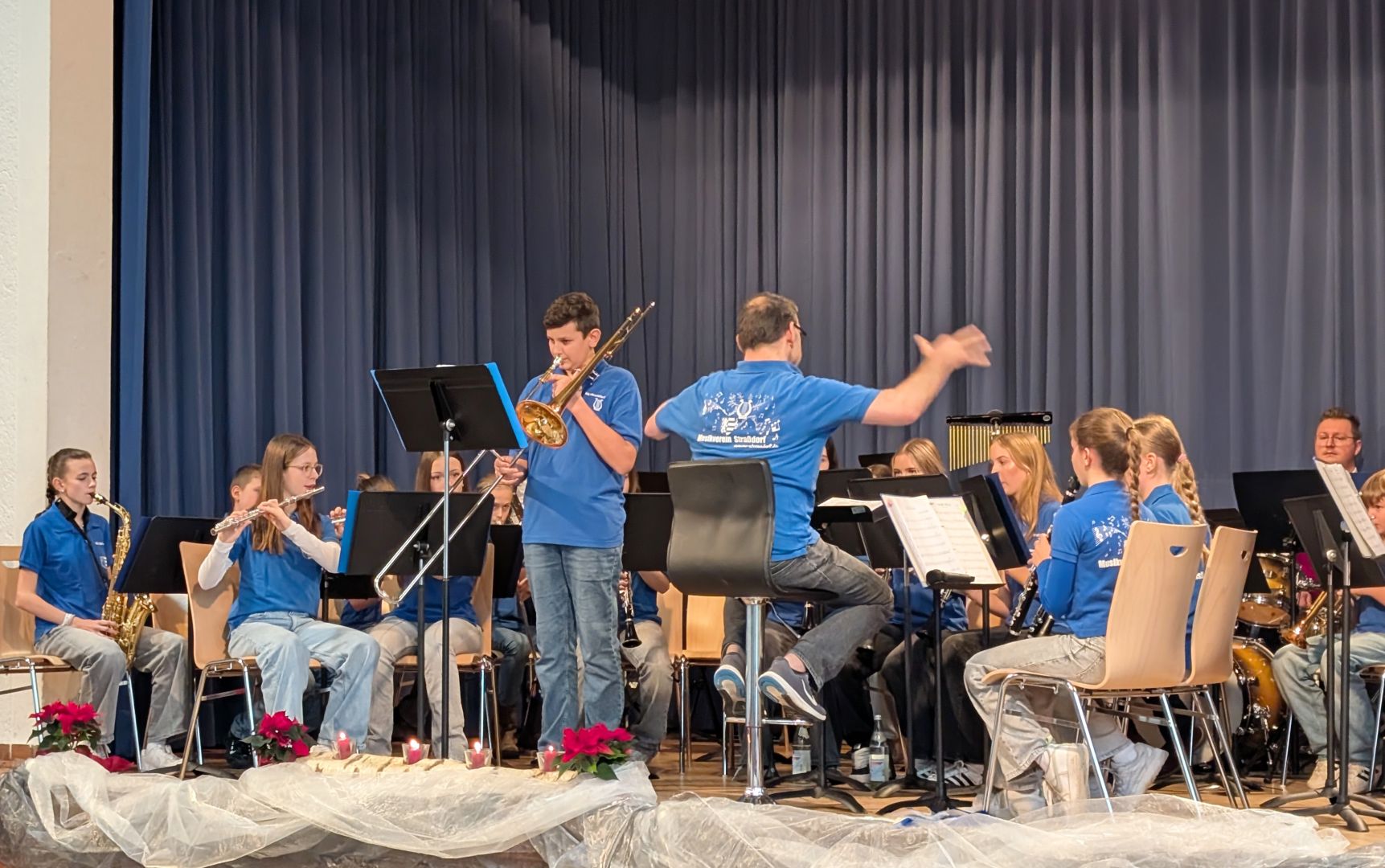4 zeigte sich schon etwas routinierter und begeisterte mit bekannten weihnachtlichen Melodien, die das Publikum sofort in festliche Stimmung versetzten. Besonders schön war zu beobachten, wie die jungen Musikerinnen und Musiker mit ihren frischen Klängen die Zuhörer zum Mitsummen und Klatschen animierten. Nach diesem gelungenen Auftakt übernahm die Jugendkapelle unter der Leitung von Marc Pöthig die Bühne. Mit „Lift Me Up“ aus dem Film „Black Panther: Wakanda Forever“ entfaltete sich ein moderner, emotionaler Sound, der die Zuhörer in die Welt des Kinos entführte. Die Musik war geprägt von kraftvollen Bläsern und einem mitreißenden Rhythmus, der die Halle erfüllte. Ein besonderes Highlight war das Posaunensolo „T-Bone Tricks“, das Eric Sutter mit beeindruckendem Können präsentierte. Die jazzigen Passagen und die humorvollen Effekte sorgten für Begeisterung – das Publikum klatschte den Solisten gleich dreimal zurück auf die Bühne. Mit dem nigerianischen Weihnachtslied „Bethelehemu“ zeigte die Jugendkapelle ihre Vielseitigkeit: Afrikanische Rhythmen und fremde Harmonien ließen die Zuhörer staunen und sorgten für einen Hauch von Exotik im Advent. Das Aktive Orchester, dirigiert von Martin Pabst, setzte den musikalischen Schlusspunkt. Mit dem Marsch „Start Frei“ wurde es festlich und schwungvoll, bevor das energiegeladene „Bon Jovi – Rock Mix“ für rockige Stimmung sorgte und die Halle in Bewegung brachte. Besonders emotional wurde es bei „My Dream“, einem Solo für Flügelhorn von Peter Leitner. Hier stand Julia Stegmaier im Mittelpunkt: Mit ihrem warmen, ausdrucksstarken Ton und gefühlvoller Interpretation zog sie das Publikum in ihren Bann und transportierte alles was das Stück zu bieten hat: romantischen Harmonien, gefühlvollen Phrasen und einer Atmosphäre, die zum Träumen einlädt. Mit dem Konzertstück „Amen“ von Pavel Staněk zeigte sich das Orchester nochmal von seiner ruhigen Seite, bevor der Calypso „Oh Yes, Believer!“ von Thiemo Kraas karibische Lebensfreude in die Halle brachte. Als Zugabe erklang das feierliche „Oh Holy Night“ – ein würdiger Abschluss, der das Publikum in vorweihnachtlicher Stimmung entließ. Der Konzertnachmittag war ein voller Erfolg und zeigte eindrucksvoll, wie Musik Generationen verbindet und Freude schenkt. Die Gäste verließen die Gemeindehalle mit einem Lächeln und der Vorfreude auf Weihnachten – und mit dem Gefühl, einen ganz besonderen musikalischen Advent erlebt zu haben.